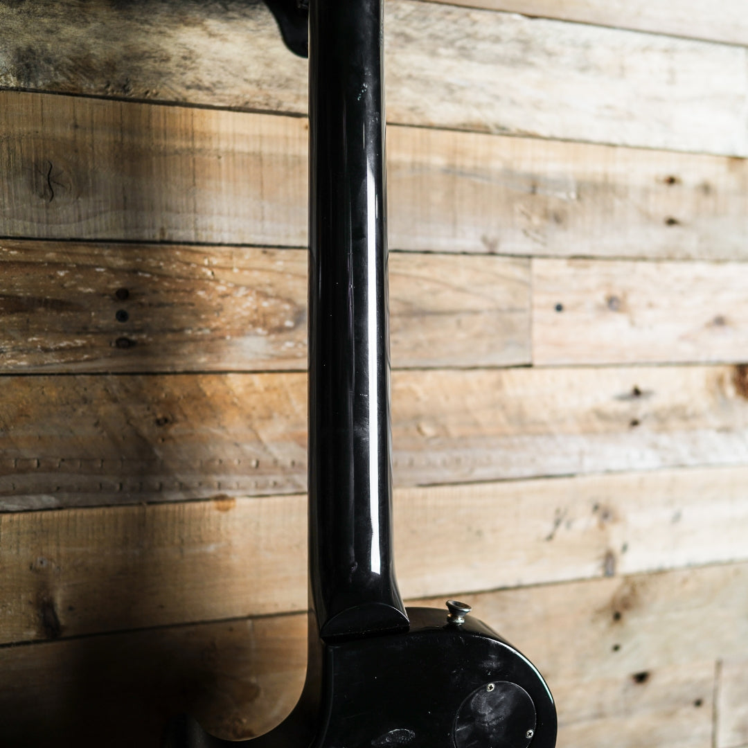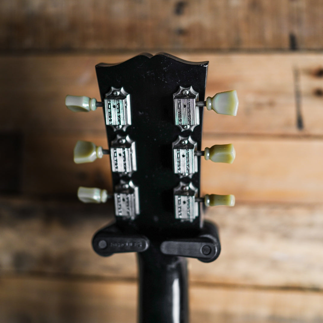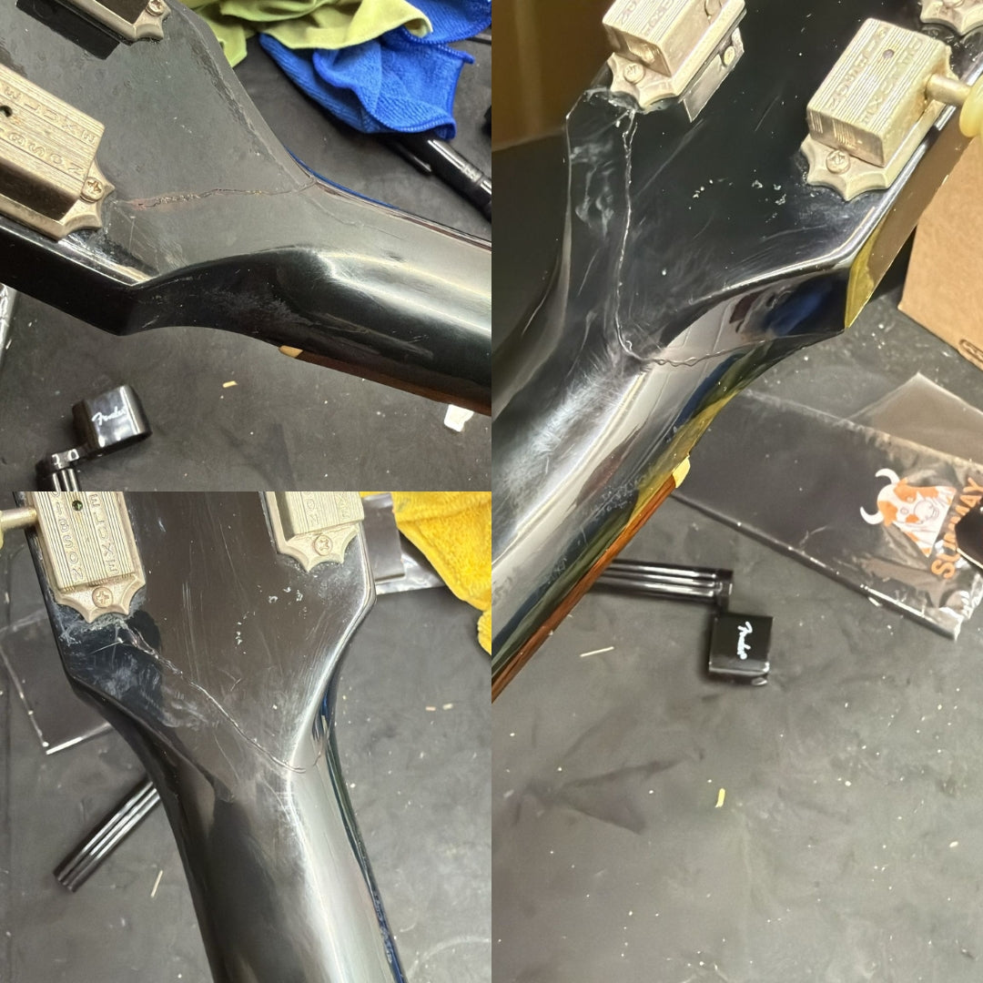 Diese Gitarre befindet sich in gutem Zustand mit Gebrauchsspuren. Der Kopf weist einen Riss auf (kein vollständiger Bruch), der von unserem Gitarrenbauer repariert wurde. Die Bünde sind noch zu ca. 80 % erhalten, und die Elektronik funktioniert einwandfrei.