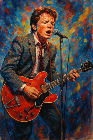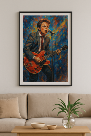 素晴らしい!マーティ・マクフライの象徴的な『バック・トゥ・ザ・フューチャー』パフォーマンスの電撃的なエネルギーを、鮮やかなA3サイズの抽象画で捉えました。豊かな色彩と表現力豊かな筆致で描かれたこの作品は、歴史を変え、フレットを溶かした、マーティの忘れられない「エンチャントメント・アンダー・ザ・シー」ダンスシーンでのギターソロへのオマージュです。