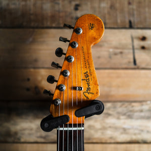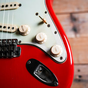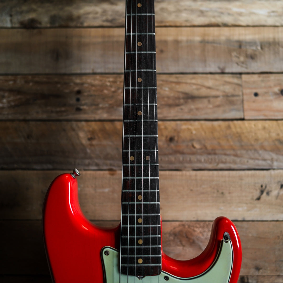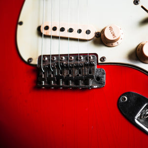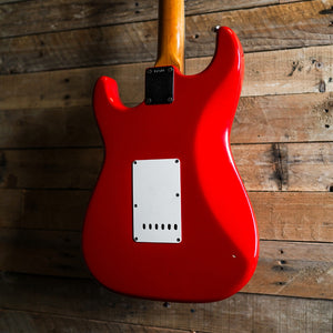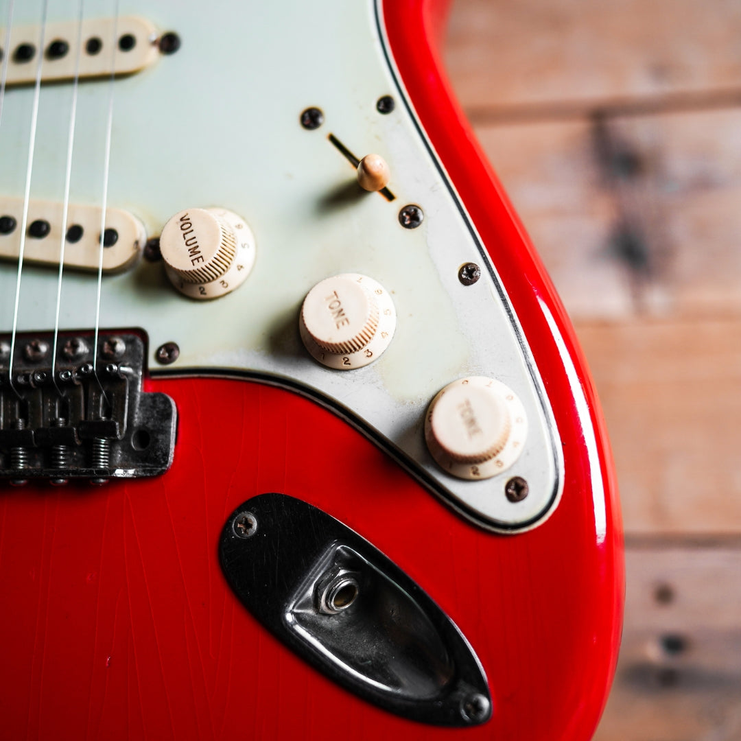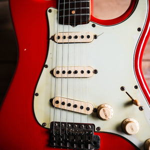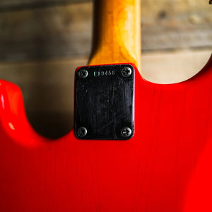 This guitar is presented in very good condition throughout. The Fiesta Red refinish has started to check nicely, and although the pickups have been replaced for a later set (dating to 1984), they still sound brilliant in this guitar. There are no large marks or dents to the guitar, just general age-related wear and checking. The guitar has been refretted, and currently show roughly 80% of life remaining. The plastics are all original, and there are a couple of cracks occurring in the usual places for an early '60s example, particularly near the right horn where the plastic has snapped off slightly.