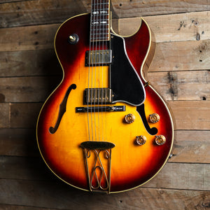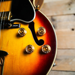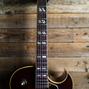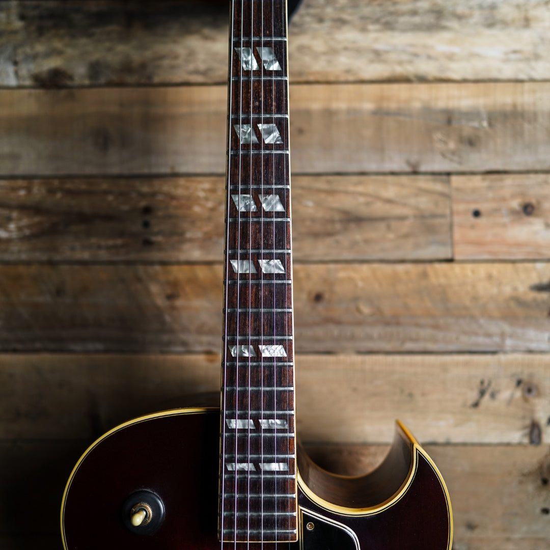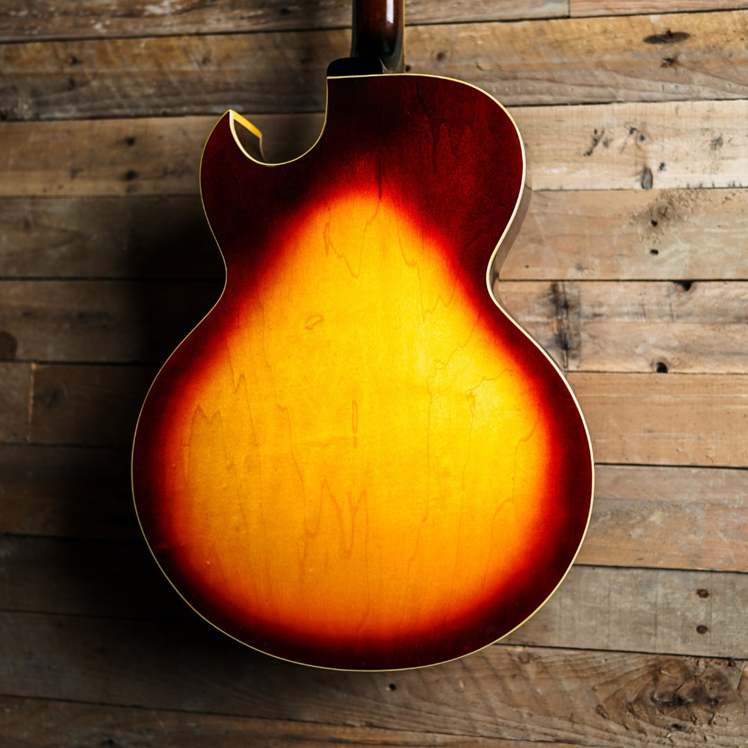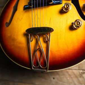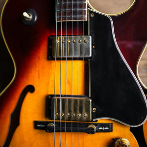 This guitar is presented in excellent condition throughout, aside from some tarnishing to the hardware, checking to the finish, and cracks to the headstock lacquer. We believe the guitar to have been a custom order with the bound headstock, 'Flying F Hole' headstock inlay and tailpiece. The electronics all work as they should and the frets show roughly 80% of life remaining.