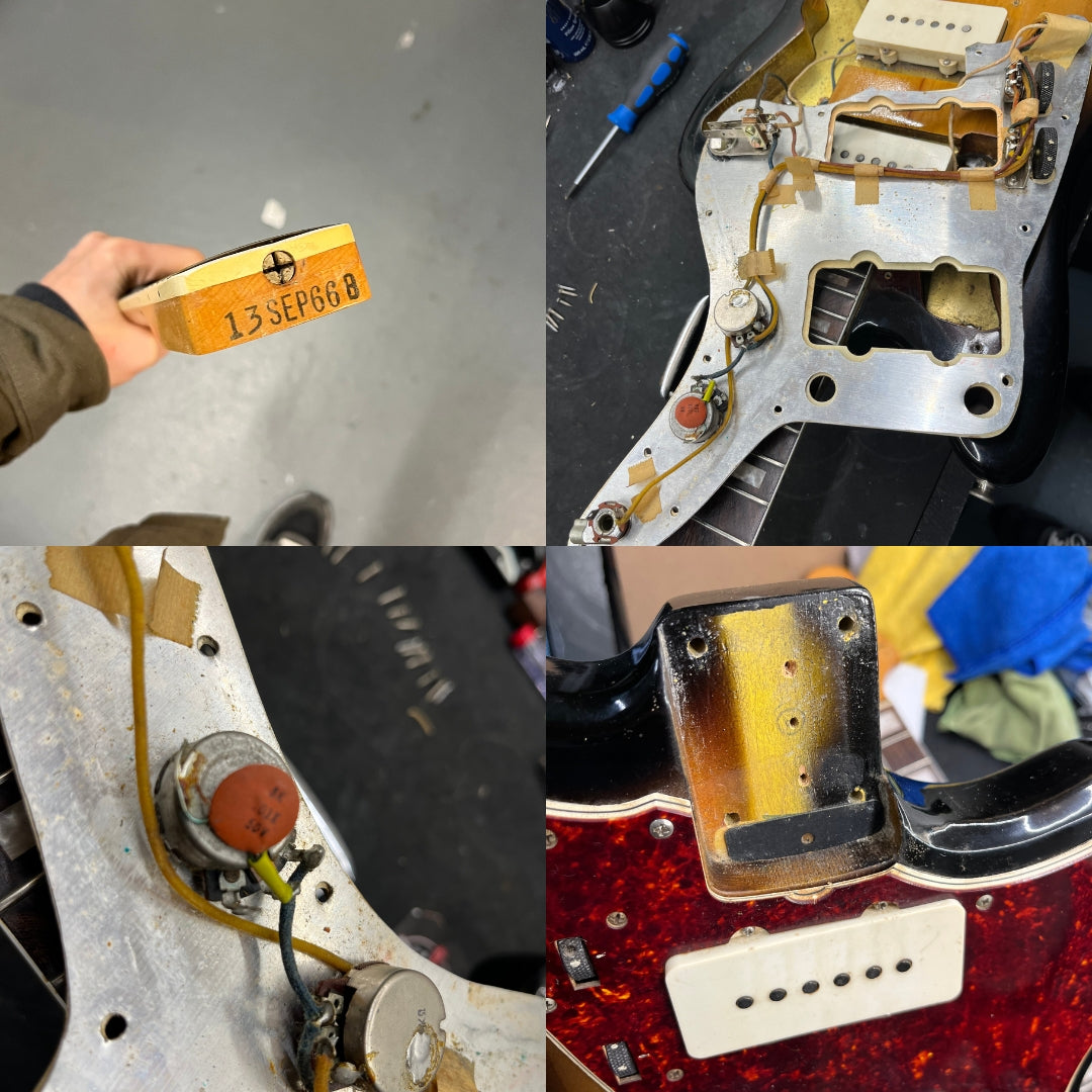 This guitar is presented in excellent condition with sings of playwear expected for it's age. The original nitrocellulose finish has faded slightly with the red of the 3-Tone sunburst fading. The volume pot has been replaced but the tone pot is original and reads 1966. Some of the screws in the pickguard have been replaced. The control knobs have been replaced with black witch had style knobs and the Tremolo arm has been replaced. The frets show approximately 70-75% of life remaining and the electronics function as expected.