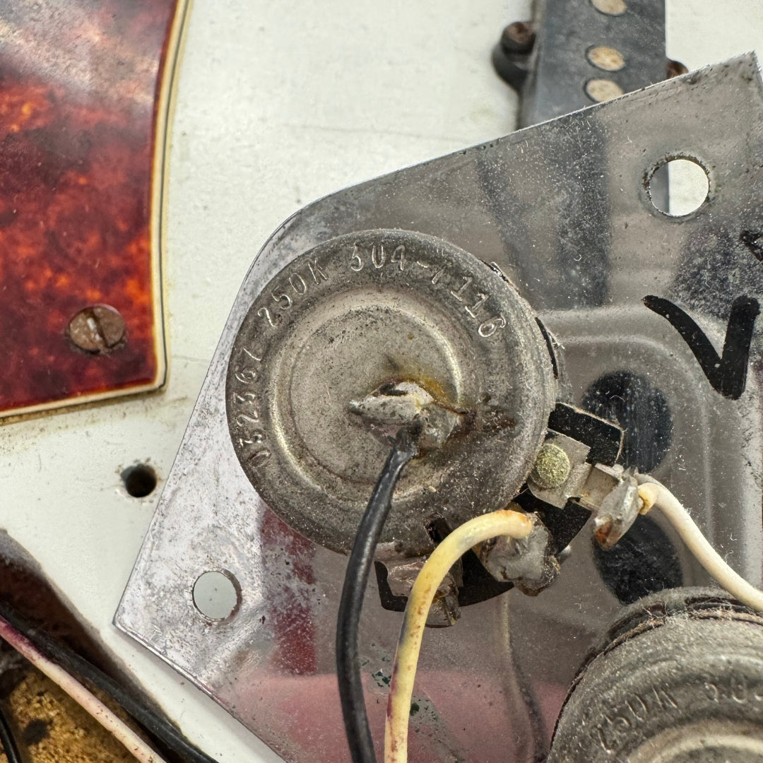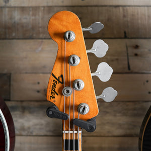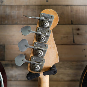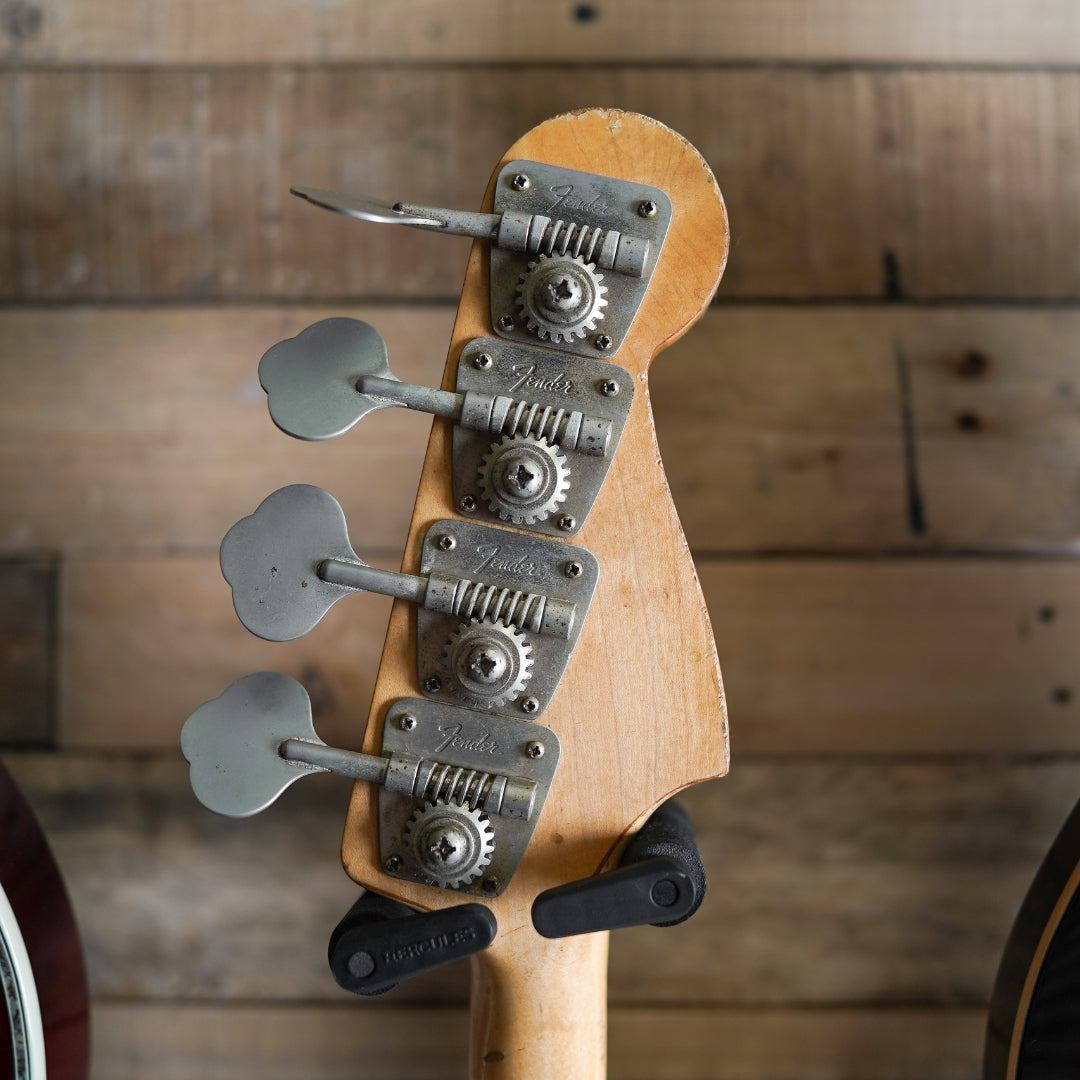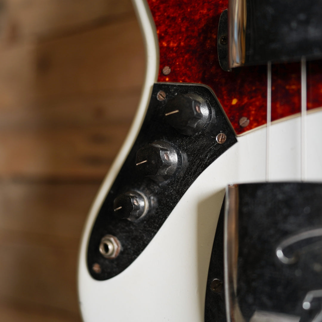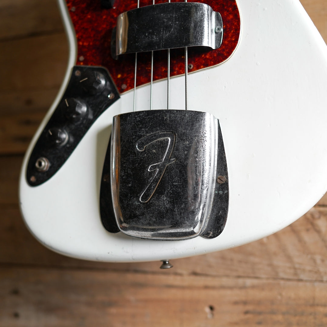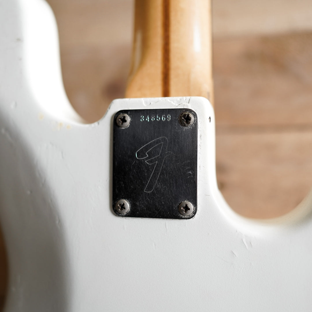 In very good, original condition throughout with some marks and wear to the finish through use. The guitar was refinished in the '70s from its original 3-Tone Sunburst, to it's current Olympic White finish. All hardware and electronics are original, with the pots dating to 1971. The original frets are in great, playable condition. This Jazz Bass weighs in at 10 lbs 2 oz.
