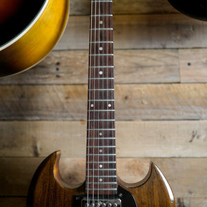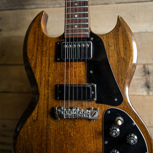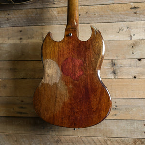 Seen here in players' grade condition with various wear and marks to the finish, this 1972 SG has been played throughout the years. The pots in this guitar date to 1972, and at some point the neck pickup was replaced for a humbucker (unknown brand/model). There are no structural breaks and the guitar still has its original frets which show some playwear.