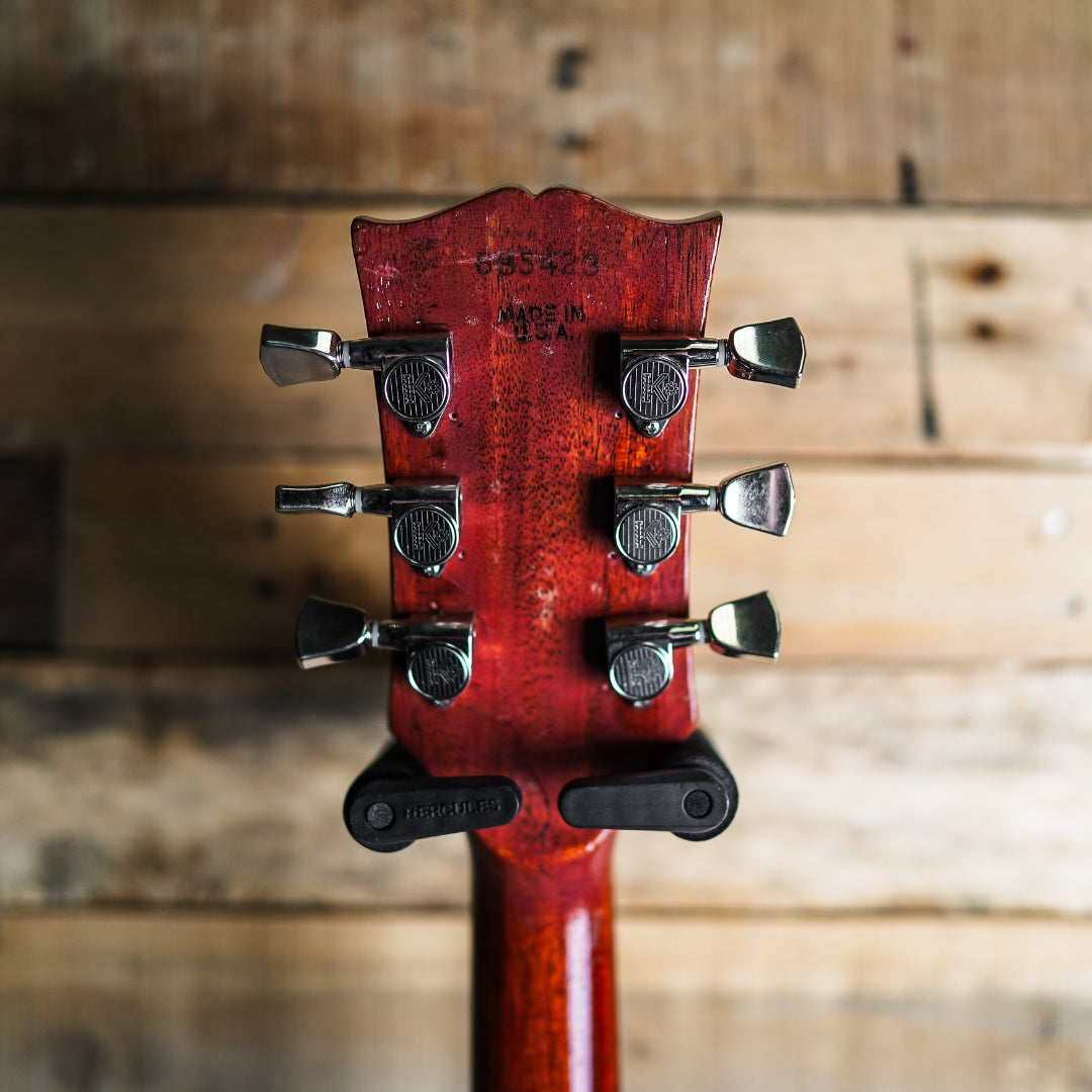 This guitar is presented in fair condition and has certainly lived a life but comes with a tonne of mojo and attitude! The guitar has had two neck repairs and there are also repairs to the body either side of the neck. The original P90s have been replaced with P90s from an unknown brand and the bridge volume and tone controls have been replaced. The control cover for the wiring is aftermarket as well as the tuners which are Klusons. The jack was relocated to the side of the guitar at some point, however this has been filled. The pickup rings have been repaired and glued back together and are stable. The frets on the guitar are well worn, but the guitar still plays and bends without fretting out, however the buyer will want to address these at some point soon. The electronics function as expected.