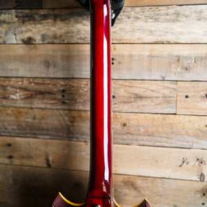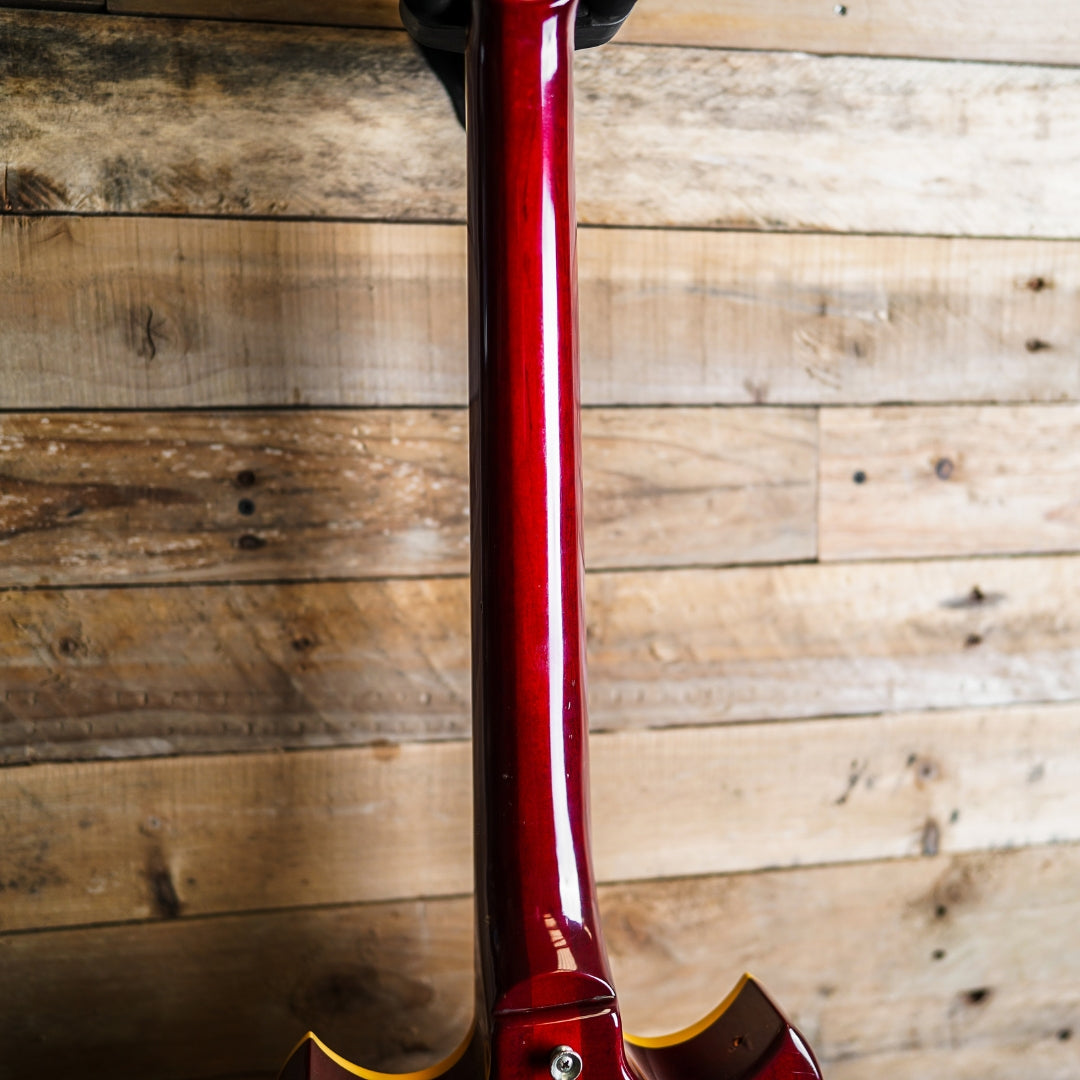This guitar is presented in very good condition with signs of considered usage. There has been a second strap button hole drilled inside one of the horns of the guitar to the right of the neck. The frets show approximately 80% of life remaining and the electronics function as expected.