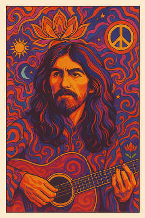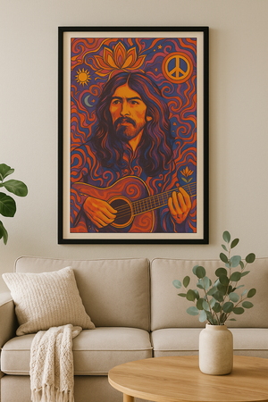 Bring the spirit of the ’70s into your space with this vibrant, psychedelic-inspired art print, paying homage to the spiritual and sonic legacy of George Harrison.