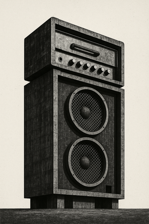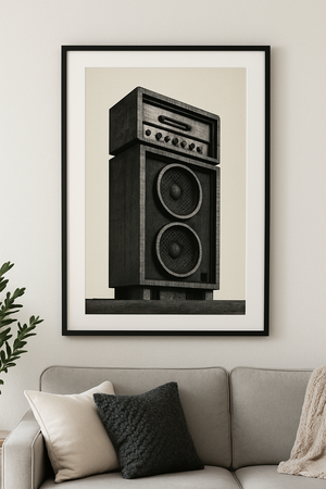 Bold, monolithic, and unapologetically raw. This architectural tribute to guitar amplification renders a towering amp structure in stark black and white, inspired by Brutalist design principles. Perfect for studio walls or modern interiors seeking edge and tone.