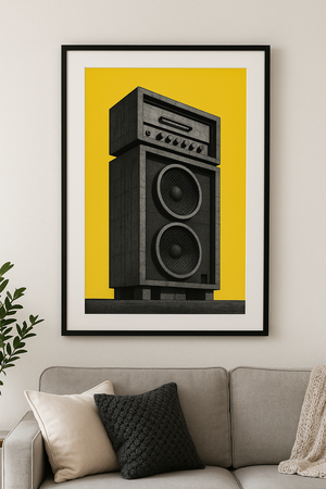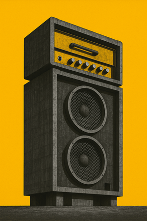 This concrete amp structure rises with power against a vivid yellow backdrop. A Brutalist fusion of music and architecture, it adds punch and precision to any creative space. Minimalist form meets vibrant energy.
