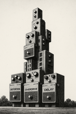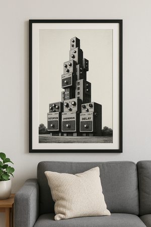 A striking monochrome tribute to brutalist architecture and guitar culture. This detailed A3 art print reimagines a towering structure built entirely from iconic guitar pedals—perfect for the minimalist tone-chaser. Printed at 330 DPI for gallery-quality sharpness.