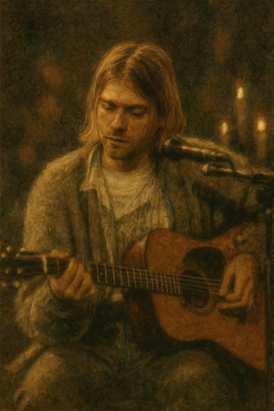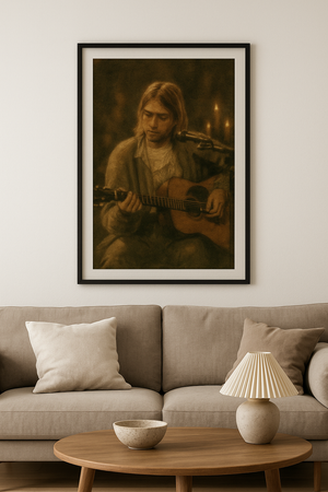 Capture the haunting intimacy of Nirvana’s 1993 MTV Unplugged performance with “Cobain Unplugged”— a textured, earthy art print steeped in candlelit atmosphere and grunge nostalgia. Rendered in soft focus with warm, muted tones, this A3-sized, 330 DPI print evokes the raw vulnerability of Kurt Cobain’s most iconic acoustic moment. A must-have for any fan of alternative rock history or emotionally resonant wall art.