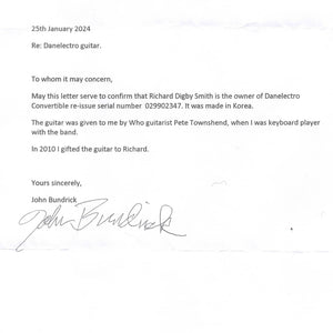 Previously owned by Pete Townshend and in excellent condition throughout, this Danelectro was passed to the current owner by John "Rabbit" Bundrick (keyboardist in The Who), and was formerly owned by the great Pete Townshend who was rumoured to use the guitar frequently pre-show as a warm-up guitar given its loud acoustic sound. The sale also includes a letter from John Bundrick to the current owner, confirming the guitars history.
