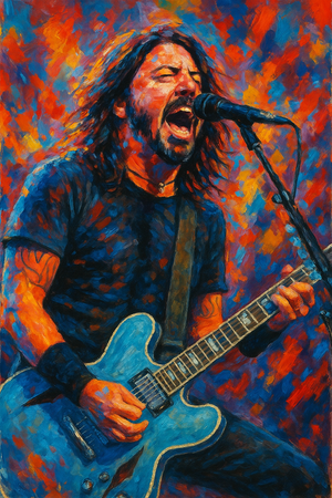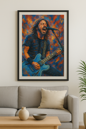 Unleash the energy of rock with this bold abstract art print of Dave Grohl performing live with the Foo Fighters. Bursting with colour and movement, it captures the raw passion of the stage in a vibrant, expressive style. A must-have for any music lover’s wall.