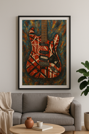 Celebrate the raw energy of Eddie Van Halen’s iconic Frankenstrat with this striking A3-sized abstract art print. Featuring bold brushstrokes and vivid colours, this 330 DPI high-resolution piece captures the spirit of innovation and guitar mastery. Perfect for music lovers, guitarists, and rock art collectors. Printed on premium stock, ready to frame and electrify your space.