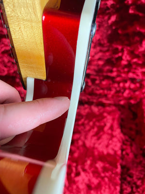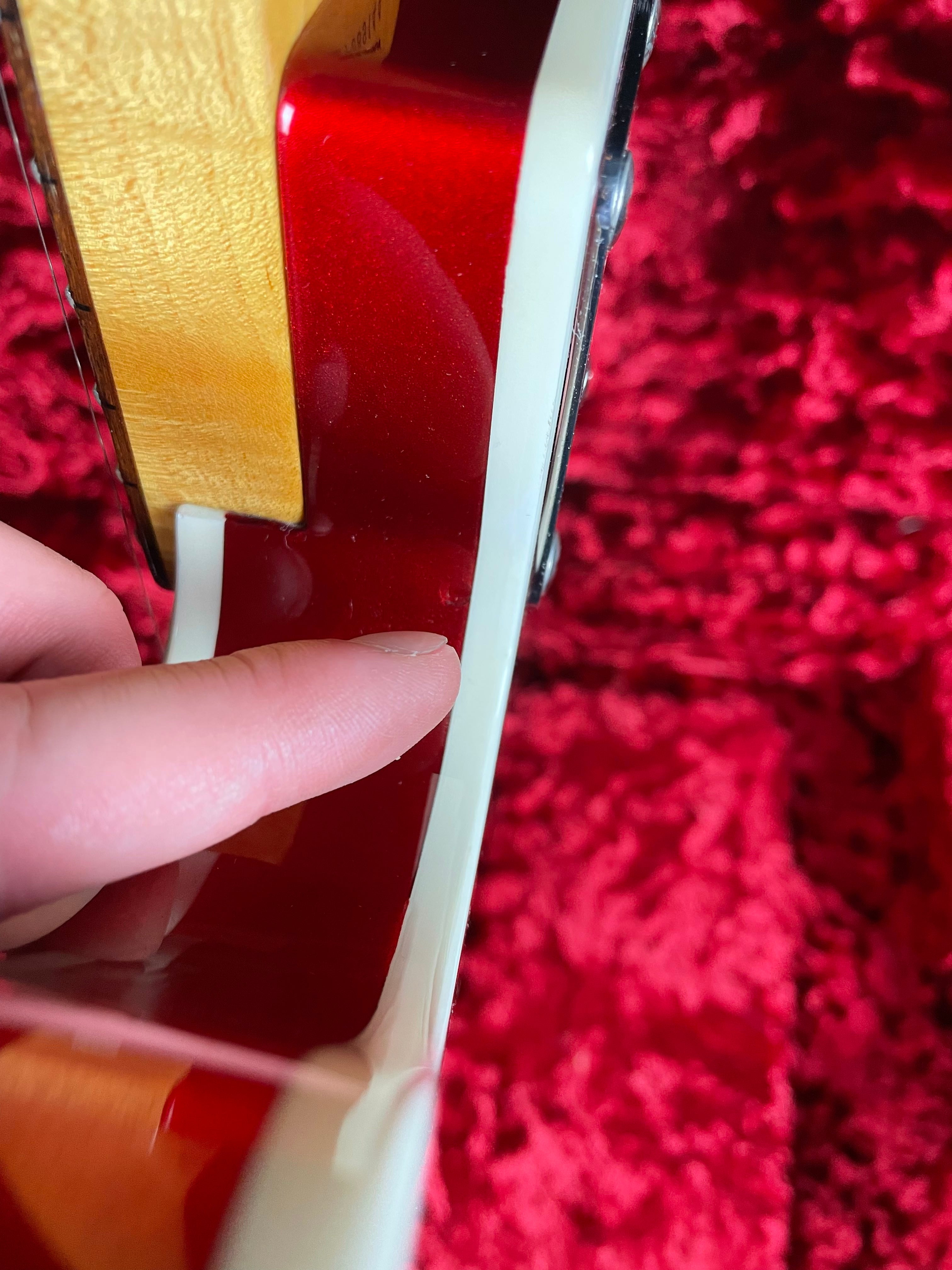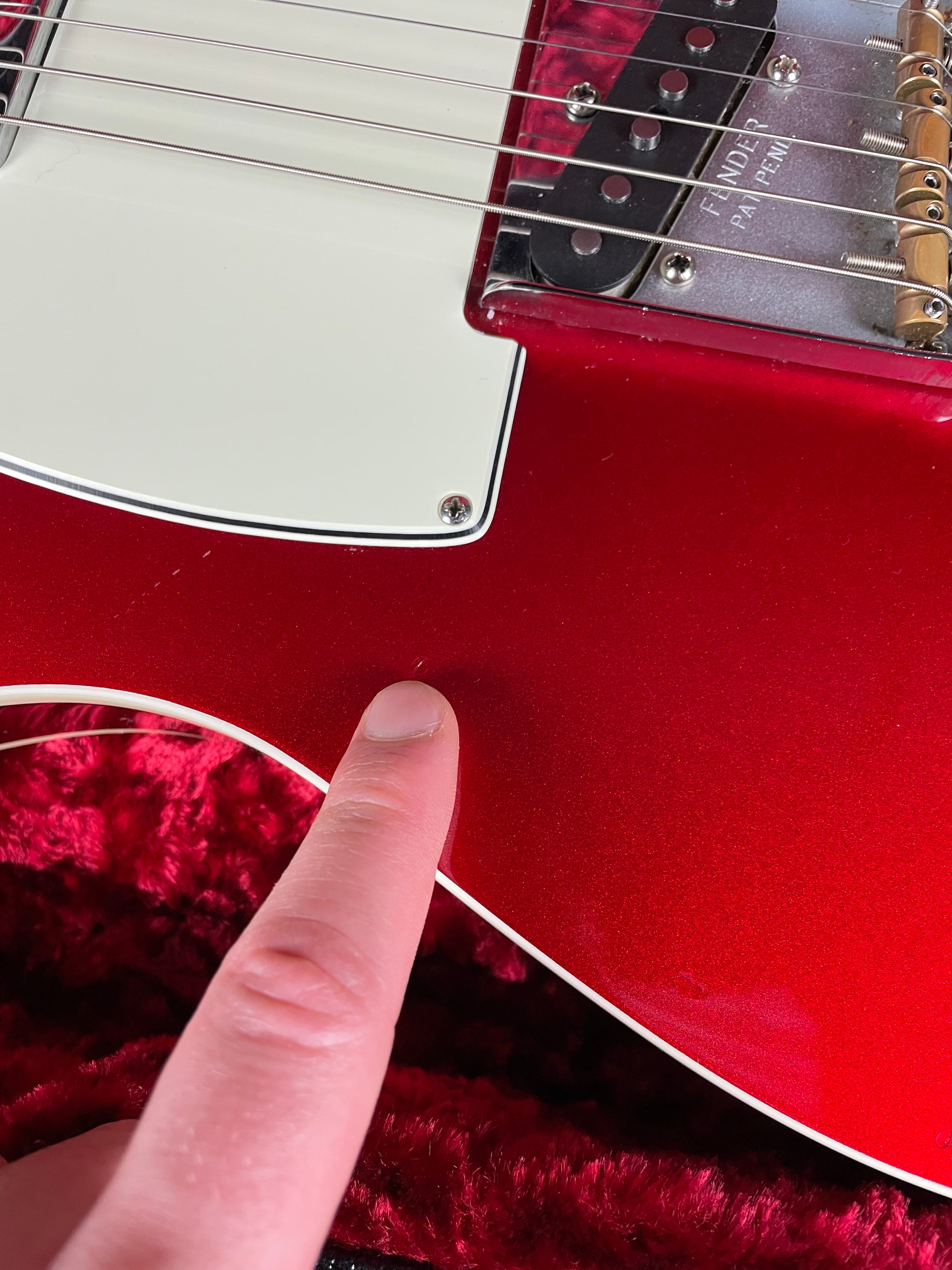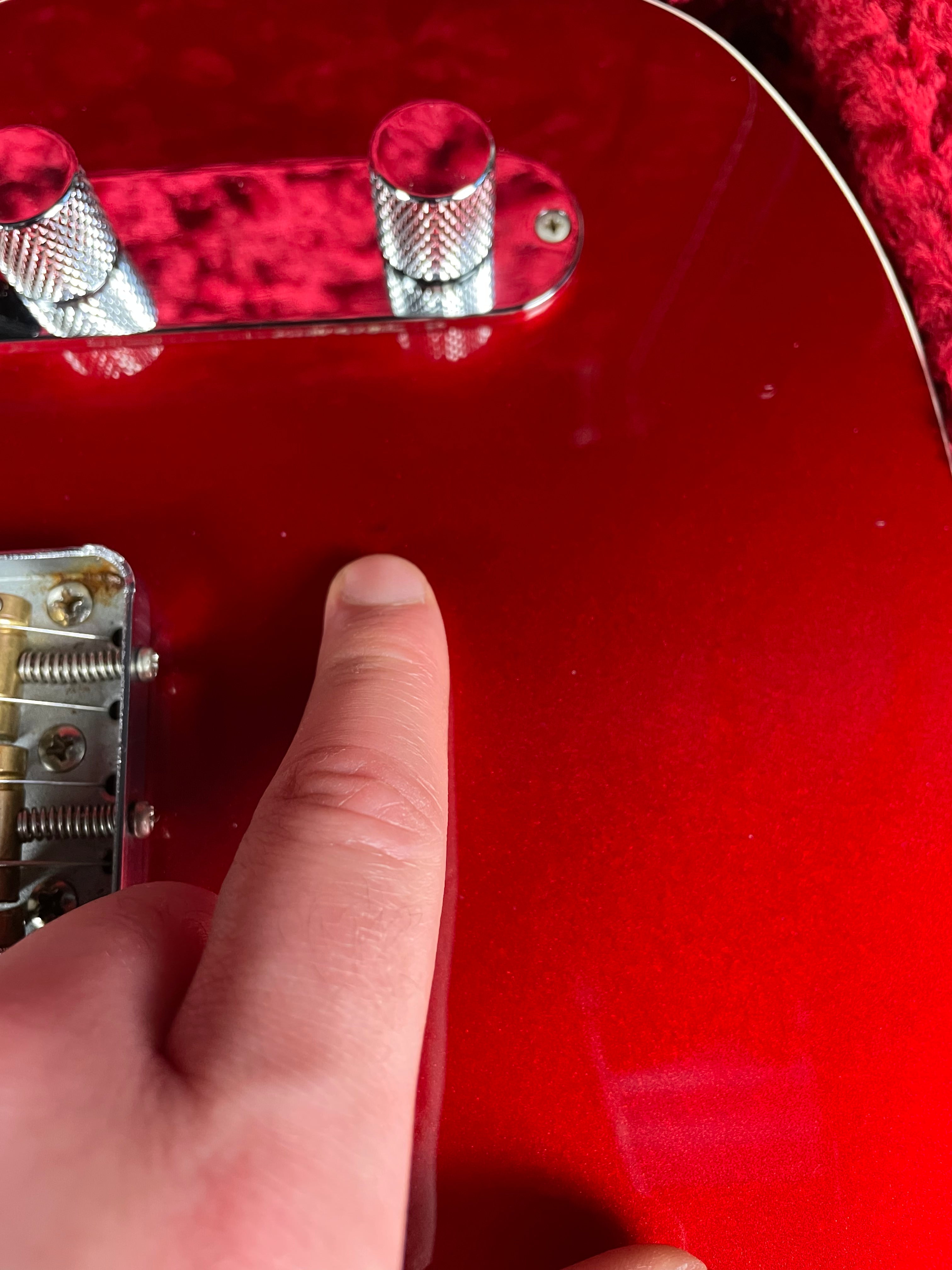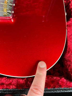 The guitar is in great overall condition with a few imperfections to the front and rear of the body. All imperfections are very hard to see/capture, and none break through the awesome Candy Apple Red finish. We've tried our best to photograph these imperfections but as mentioned, they're hard to see under natural light. A previous owner created a small body route under the pickguard (presumably for a kill switch modification or similar), but this has since been professionally filled. Aside from this, the guitar is in fantastic condition with plenty of fret life remaining, electronics work as they should, and the guitar sounds amazing thanks to a pair of upgraded pickups.