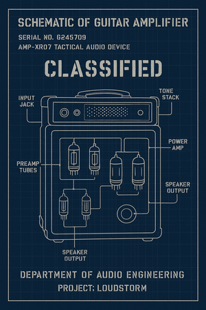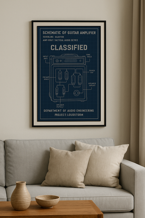 Bring a touch of tactical style to your space with this high-quality A4 blueprint poster, featuring a fictional “Classified” guitar amplifier schematic. Designed in authentic military blueprint style, this print is perfect for musicians, engineers, and design enthusiasts. Printed on premium paper for vibrant colour and crisp detail — ideal for framing and displaying in studios, living rooms, or creative spaces.