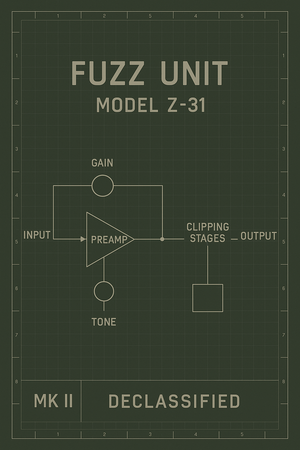 Bring military-grade style to your space with this striking blueprint poster of the fictional Fuzz Unit Model Z-31. Designed with crisp white schematics over a deep military green background, this poster captures the spirit of classic audio engineering and vintage military design. Perfect for musicians, gear-heads, and collectors. Printed on high-quality stock, ready for framing.