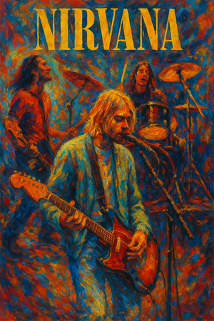 Capture the raw energy of Nirvana with this stunning A3-sized abstract art print, inspired by their legendary live performances. Featuring bold, expressive brushstrokes and vibrant colour work, this high-resolution 330 DPI piece pays homage to Kurt Cobain and the band’s iconic grunge legacy. Printed on premium quality stock, it’s the perfect centrepiece for any music lover’s space.