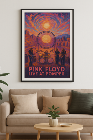 Immerse yourself in the psychedelic legacy of Pink Floyd with this stunning abstract art print inspired by their legendary Live at Pompeii performance. Rendered in vivid, swirling colours, this A3-sized, 330 DPI print captures the atmospheric intensity of the band against the haunting ruins. Perfect for music lovers, collectors, and Floyd fanatics alike.