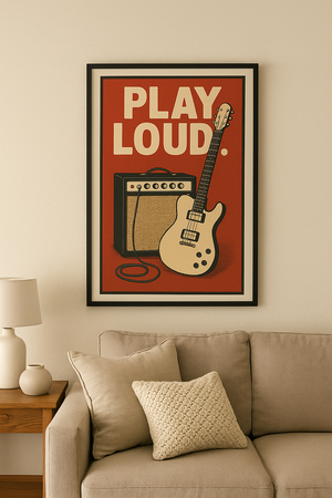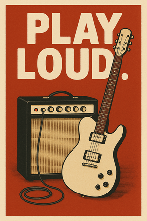 Unleash your inner rockstar with this bold, retro-style Play Loud! poster. Featuring a cream electric guitar and vintage amp on a rich red backdrop, this high-quality A4 print brings energy and attitude to any space. Perfect for music lovers, guitarists, or anyone who lives loud.