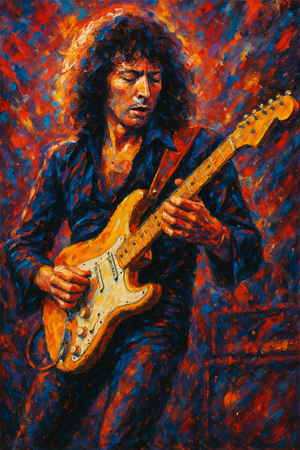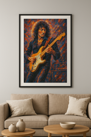 Immerse your space in the electrifying energy of classic rock with this abstract art print of Ritchie Blackmore performing live. Capturing his iconic intensity in vivid strokes and fiery hues, this A3-sized, 330 DPI piece is perfect for guitar lovers and Deep Purple fans alike. Museum-quality, print-ready—ideal for any music room, studio, or stylish living room wall.