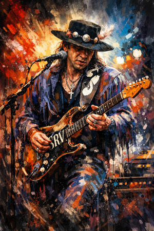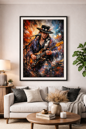 Celebrate raw blues power with this striking abstract art print inspired by Stevie Ray Vaughan in full flight on stage. Explosive colour, expressive brushwork, and a dynamic live-performance pose capture the intensity, sweat, and soul of SRV at his peak.