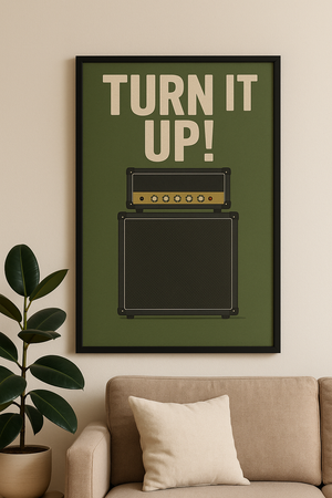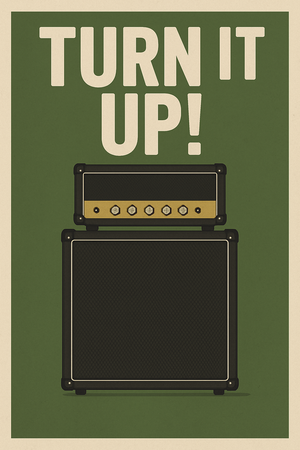 Infuse your space with vintage rock energy and military cool with our Turn It Up! – Army Green Edition poster. Featuring a rugged guitar amplifier stack on a deep U.S. Army green backdrop, this print combines retro grit with timeless attitude.