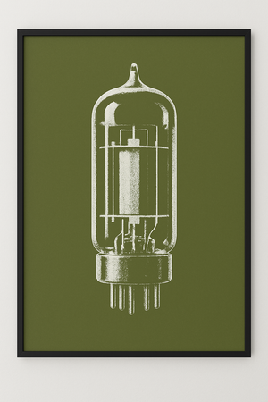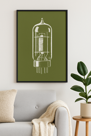 Celebrate analog tone with this bold A4 poster featuring a white vacuum tube illustration on a military-inspired US Army Green background. Designed for musicians and vintage audio lovers, this high-contrast print adds a rugged, stylish edge to any space. Printed on premium-quality paper—ready to frame or gift.