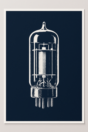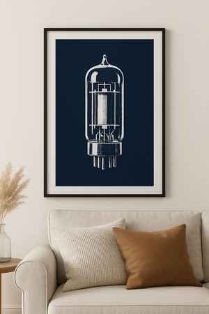 Bring vintage tone into your space with this striking A4 poster featuring a white vacuum tube on a deep blue background. Inspired by classic guitar amp valves, this high-contrast design adds a bold, musical edge to any room. Perfect for musicians, audiophiles, or anyone who appreciates analog beauty. Printed on premium quality stock, ready to frame or gift.