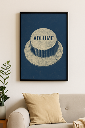 Add a bold, minimalist statement to your space with this A4 art print featuring a distressed white guitar volume knob on a deep blue background. Perfect for music lovers and modern interiors, this high-resolution poster delivers vintage character with contemporary style. Ready to frame.